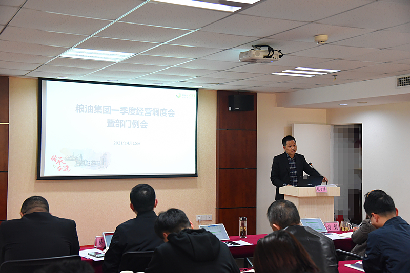 2021年4月15日下午,粮油集团召开一季度经营调度会暨部门例会,粮油集团公司领导、本部各部室负责人及各二级子公司负责人参加会议。粮油集团党委委员、总经理宛三林主持会议。