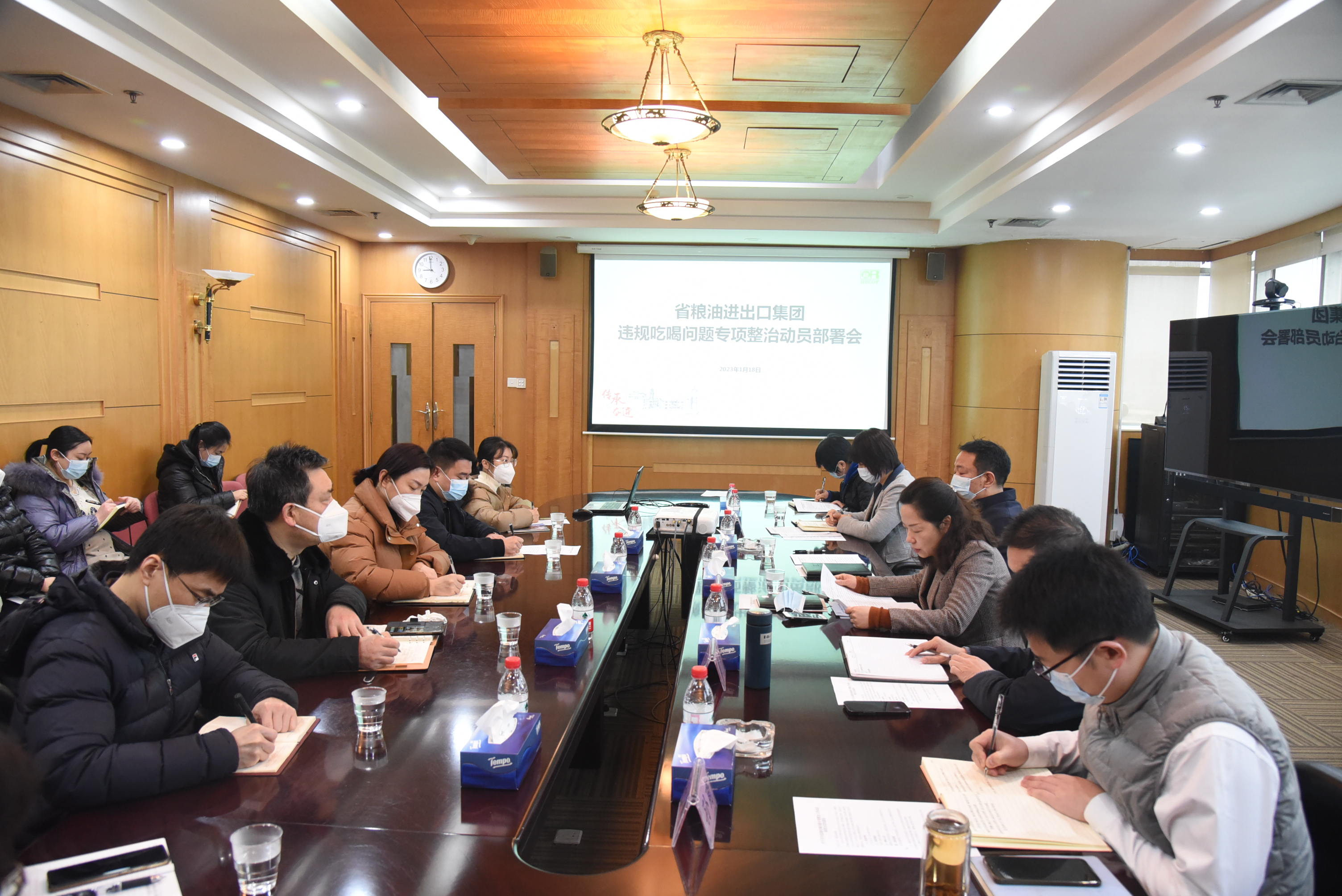 1月18日,省粮油进出口集团召开违规吃喝问题专项整治工作动员部署会,集团领导班子、总经理助理、总法律顾问、各部室负责人及子公司负责人参加会议。