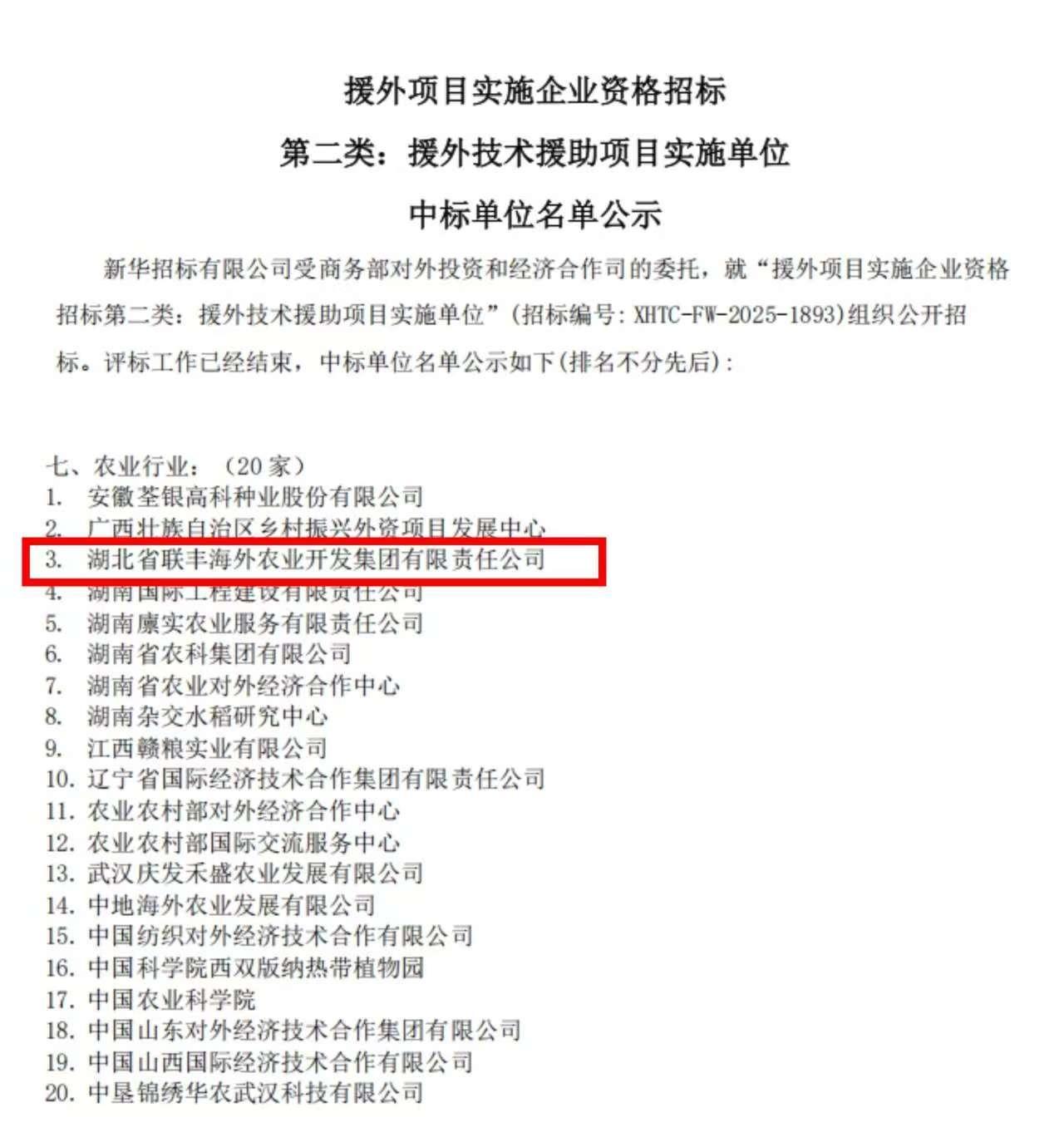 近日,商务部援外项目实施企业资格招标(第二类:援外技术援助项目实施单位)结果公示。湖北农发集团旗下省粮油进出口集团联丰海外凭借卓越的项目履约能力、扎实的专业技术实力以及良好的行业口碑,再次获得援外项目实施企业资格。这一国家级资质的再次授予,既是对联丰海外多年来在援外领域工作成效的权威认证,也为企业深度赋能国际合作、服务“一带一路”建设注入强劲动力。